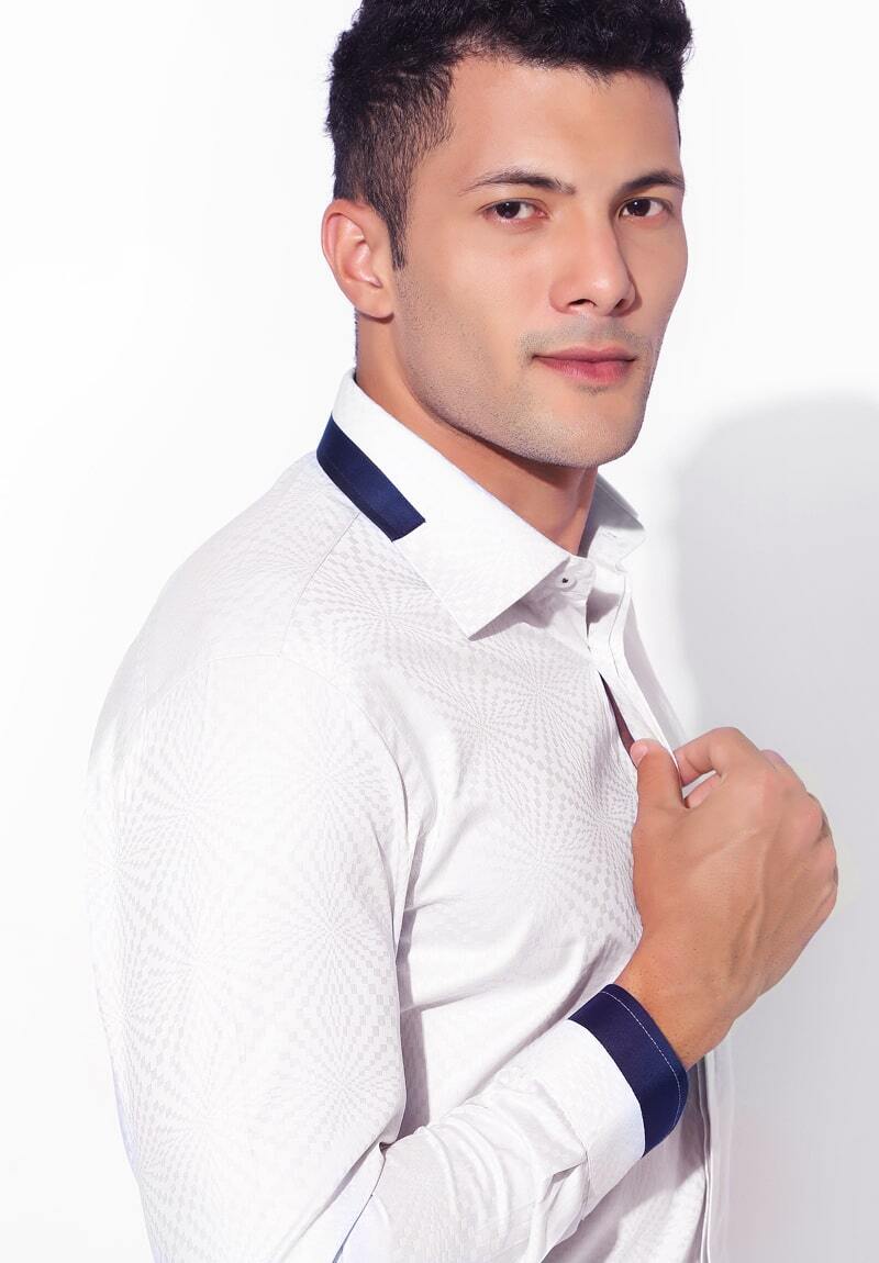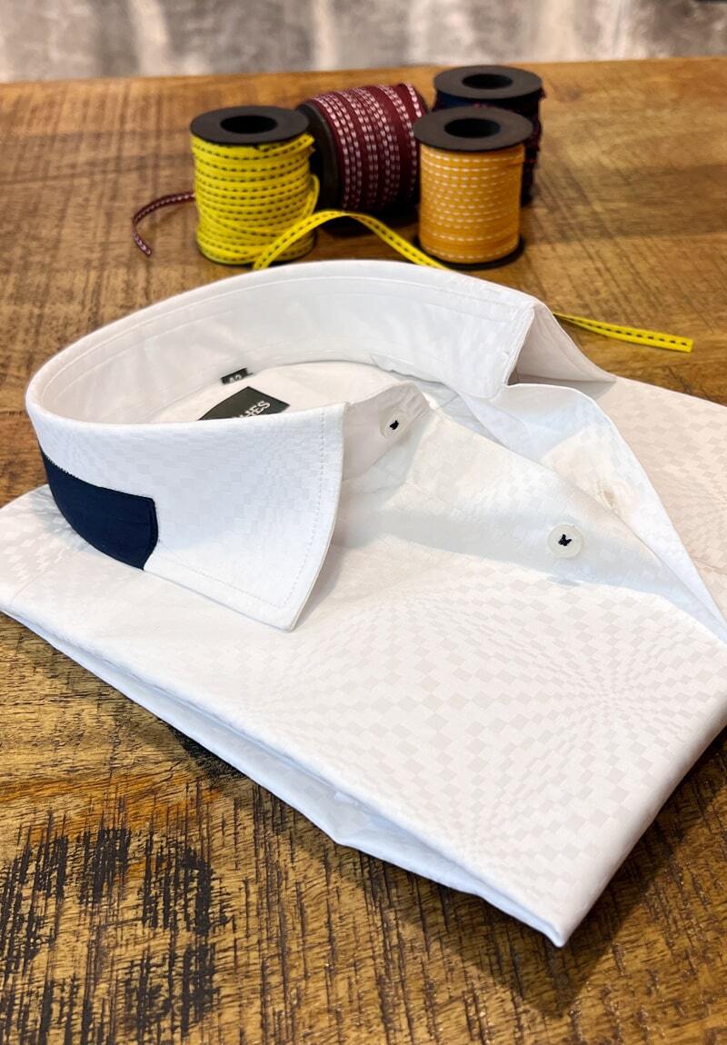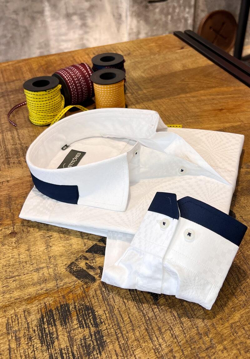 The White Shirt That Says It All! Crafted in premium jacquard fabric, it redefines elegance with its classic styling and sophisticated texture. Perfect for moments when subtlety makes the boldest statement. White Shirt with Navy blue contrasts. 2 by 80's Egyptian cotton fabric