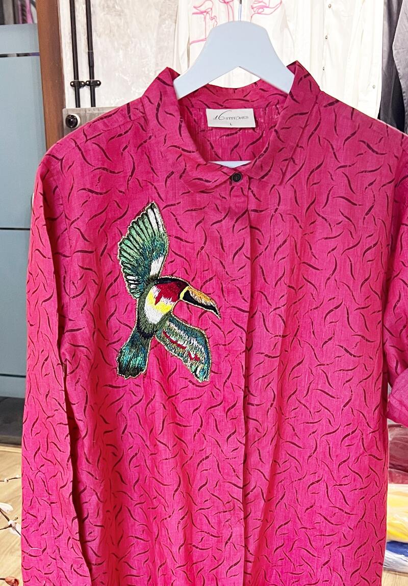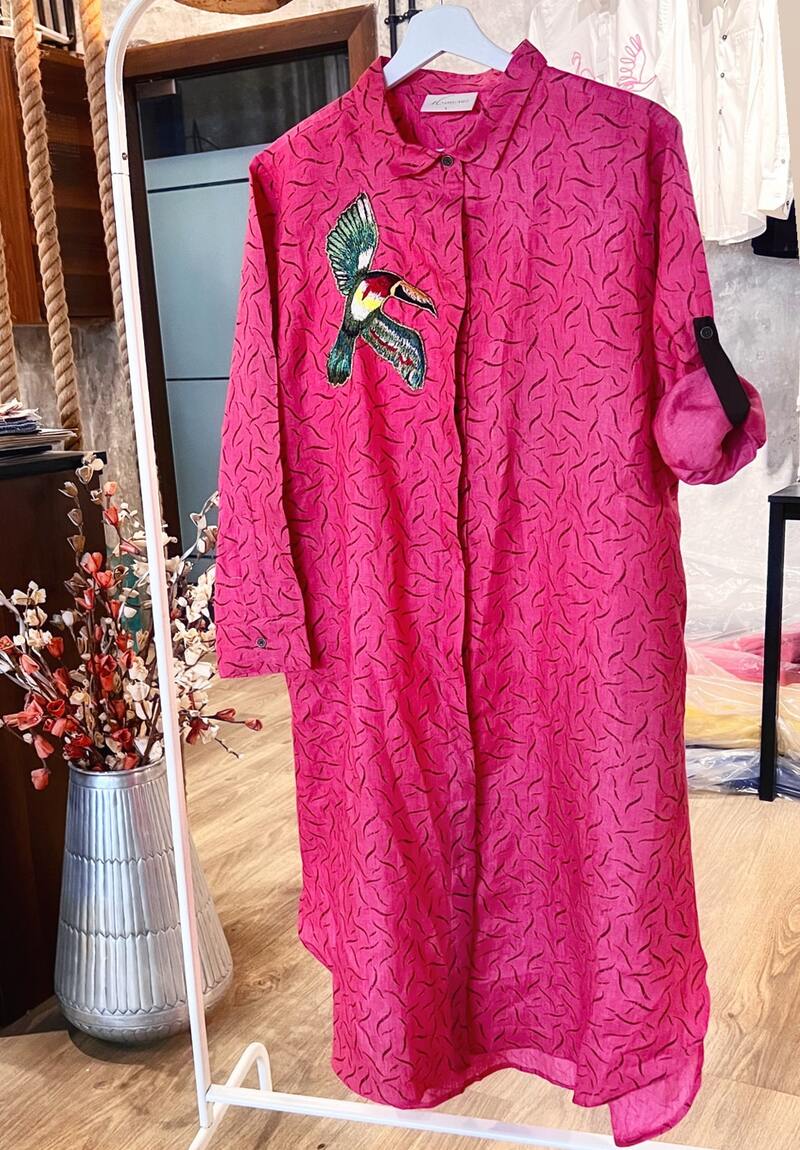 The Classic Fushcia Pink linen dress, with the absolutely trendy embroidery design. This one's a winner! 100% Linen